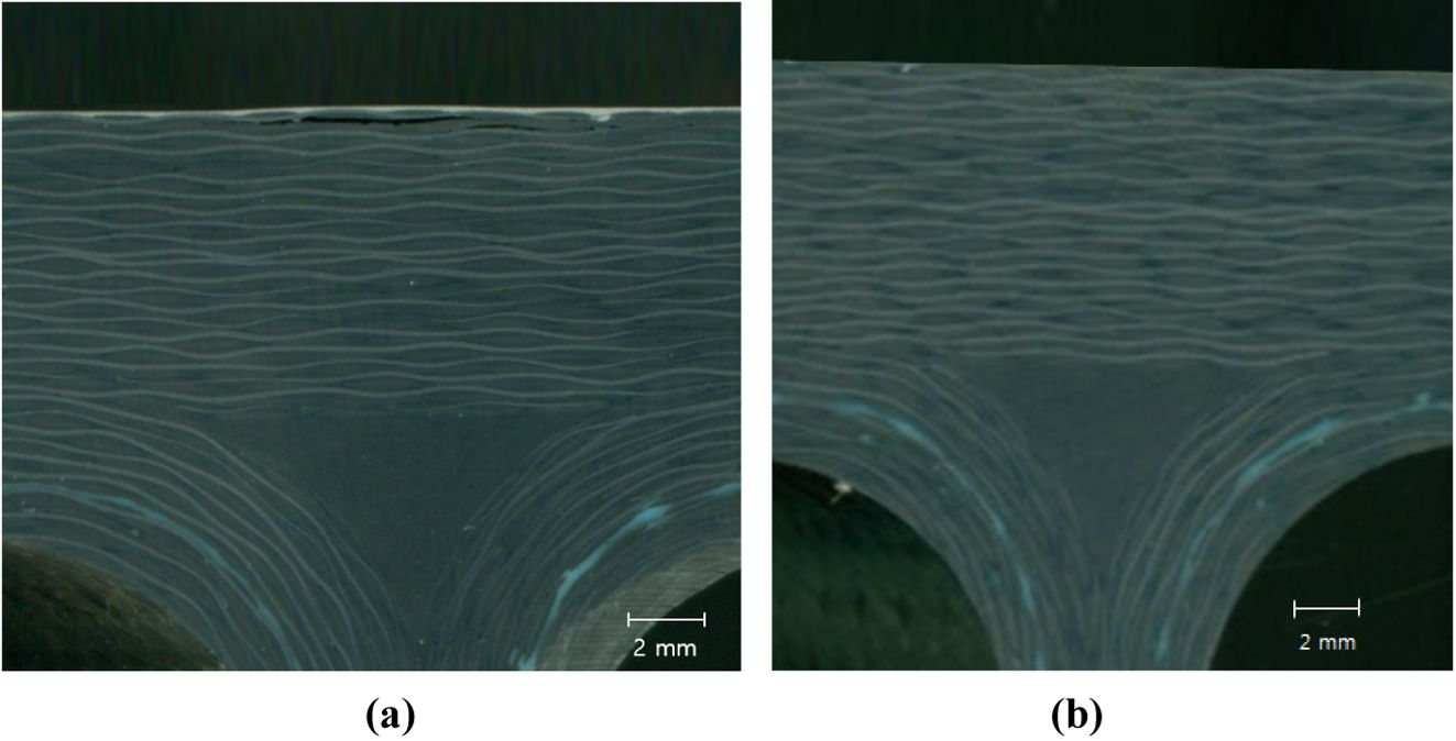 억제할 만한 충분한 수지 압력의 전달이 어려워지므로 국부적인 기공 생성 원인 될 수 있다. 특히, Fig. 4에서 보는 바와 같이 많은 복합재