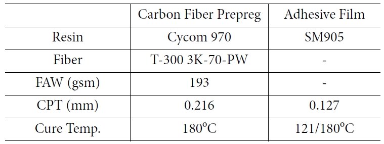 본 연구에서는 탄소섬유 강화 프리프레그(Cycom 970/T-300 3K-70-PW, Solvay 사)와 표면접착필름(SM 905,