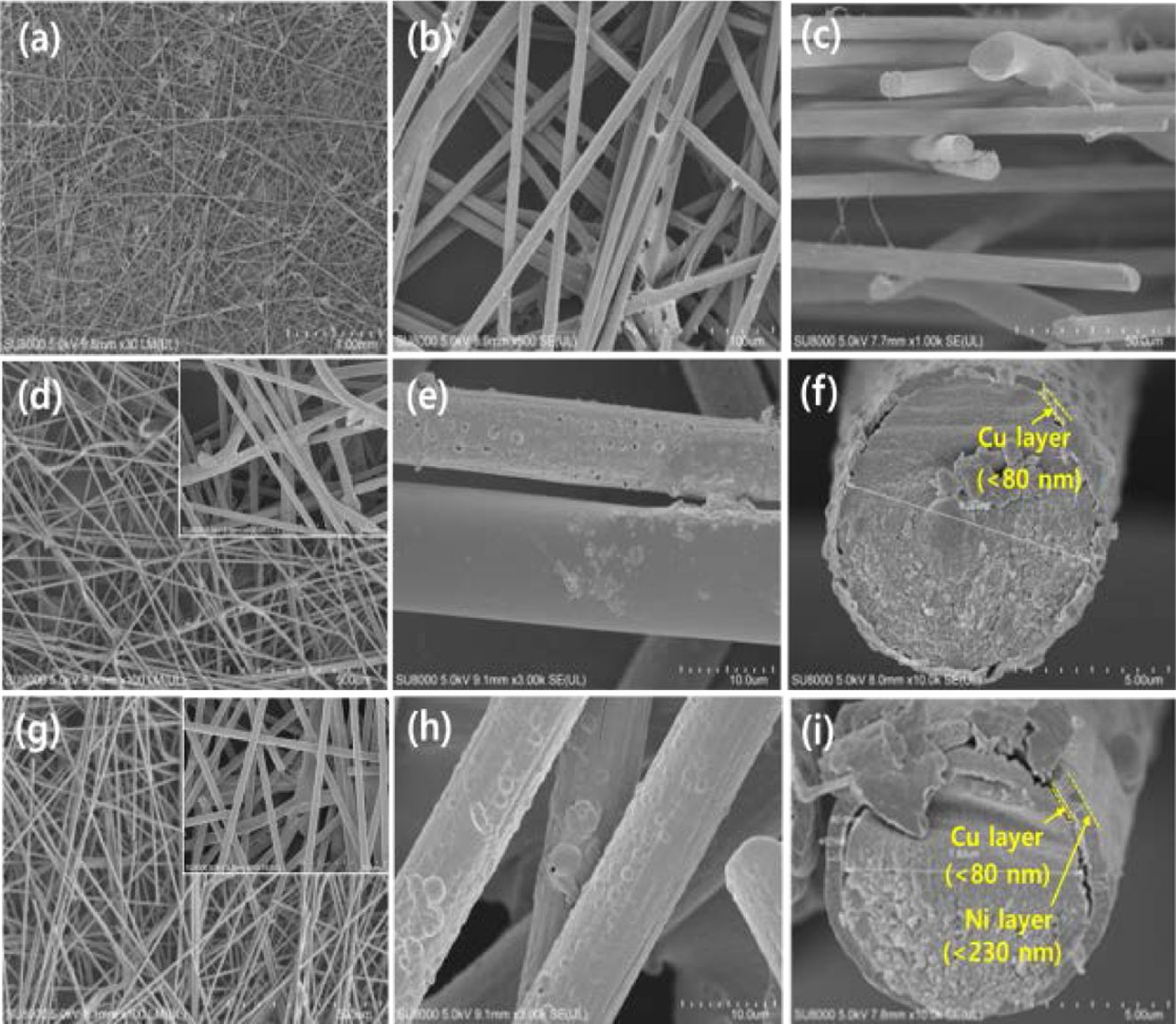 Ni-Cu/CF 또한 Cu층 위로 Ni 코팅층이 균일하게 형성된 것을 Fig. 2(i)에서 확인하였다. 이와 같은 결과를 통해 본 연구에서 제안한