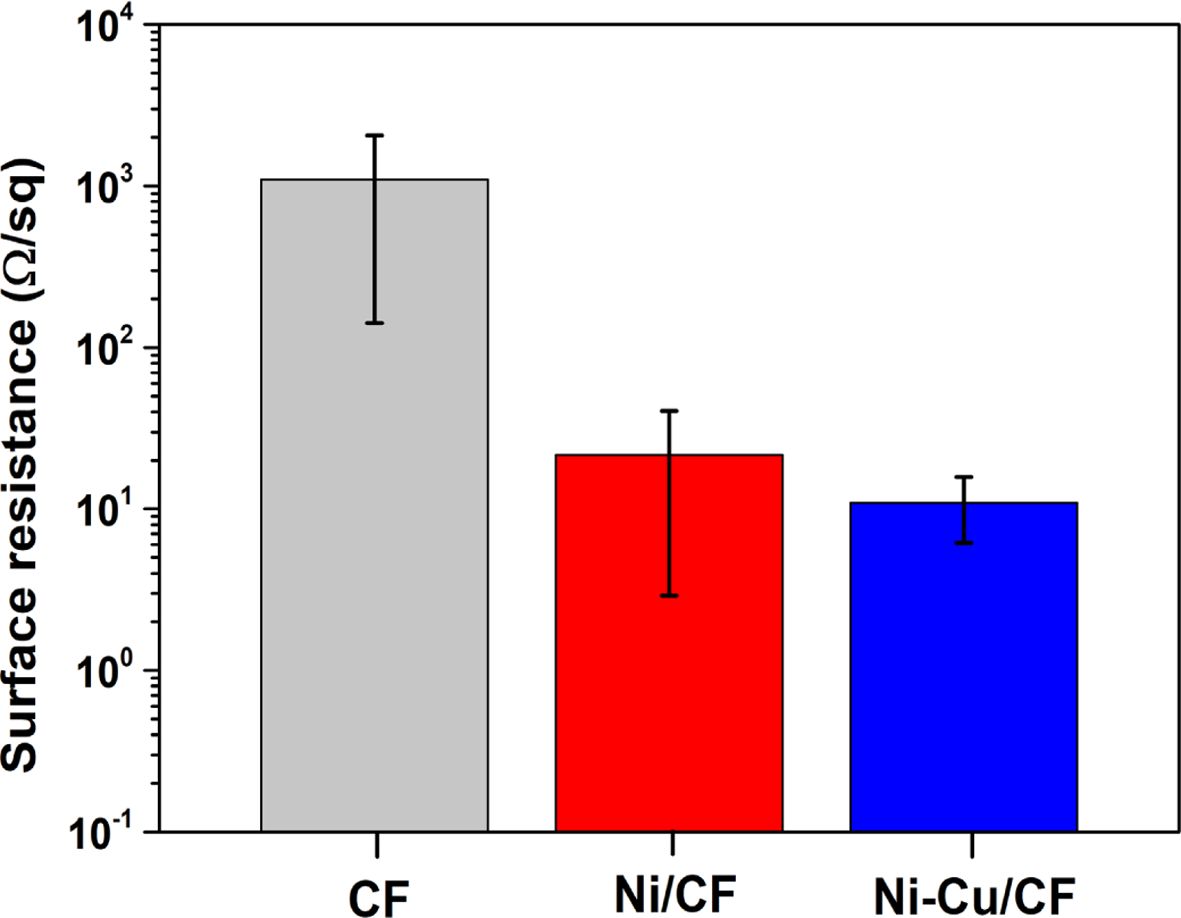 CF 시트와 비교하여 약 2배 감소한 표면저항 값을 나타내었다. 이는 내부 코팅층으로 형성시킨 Cu 코팅층의 높은 전기전도도 특성 때문인