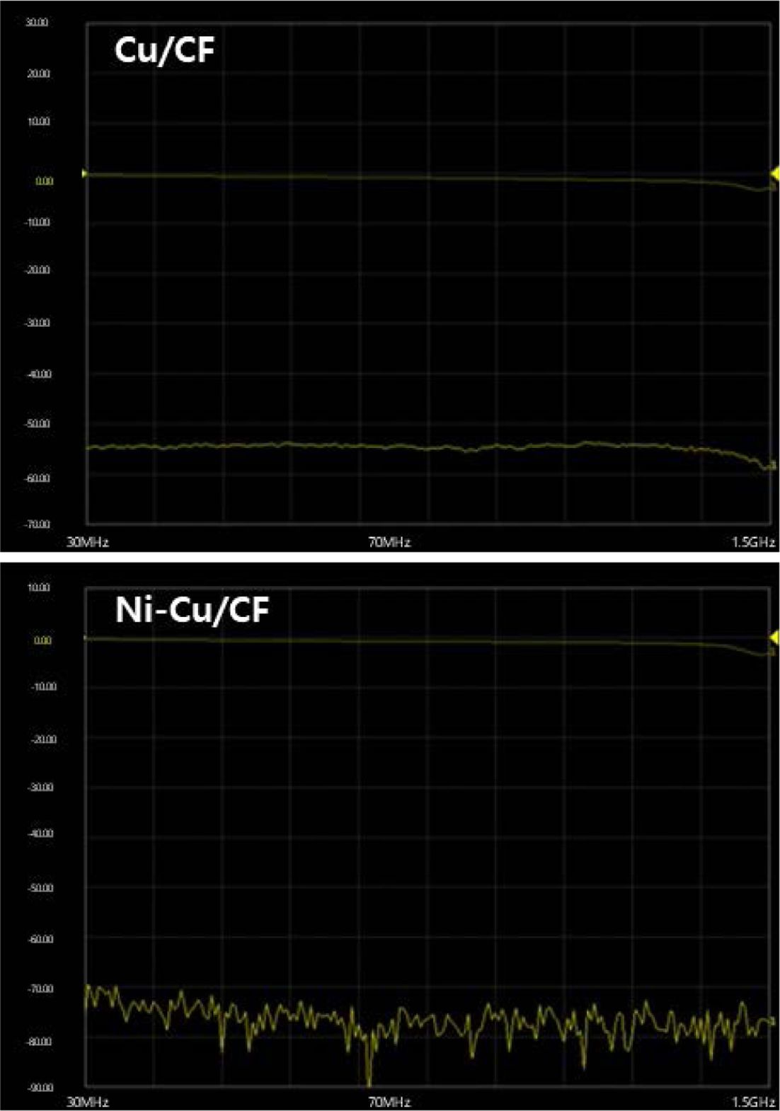 급격하게 감소된 표면저항이 전자파 차폐 특성에 미치는 영향을 확인하기 위해서 Cu/CF, Ni-Cu/CF 시트의 전자파 차폐 성능을