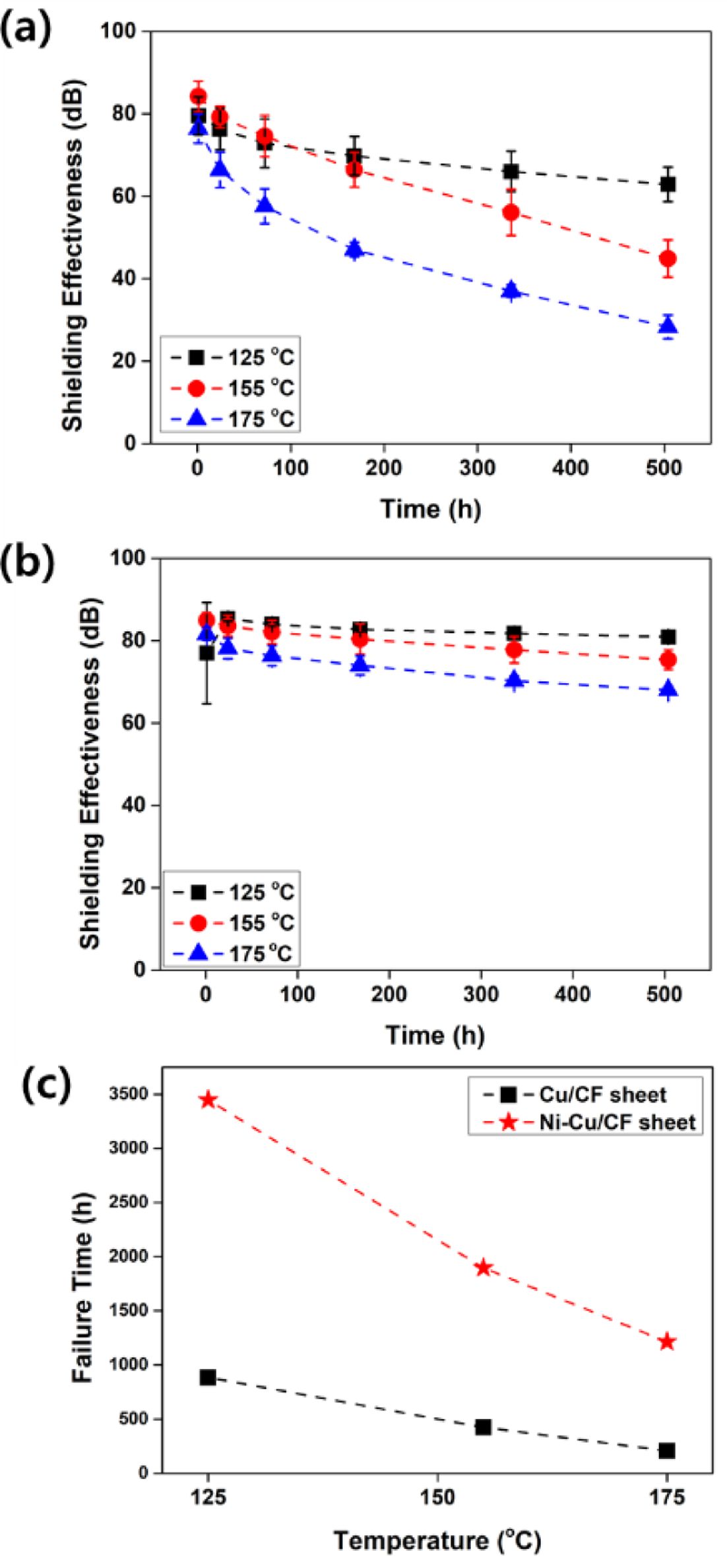 전자장치의 기준 사용조건보다 높은 온도의 가혹조건하에서 Cu/CF 또는 Ni-Cu/CF 시트의 전자파 차폐효율이 50 dB가 되는 시간을 측정