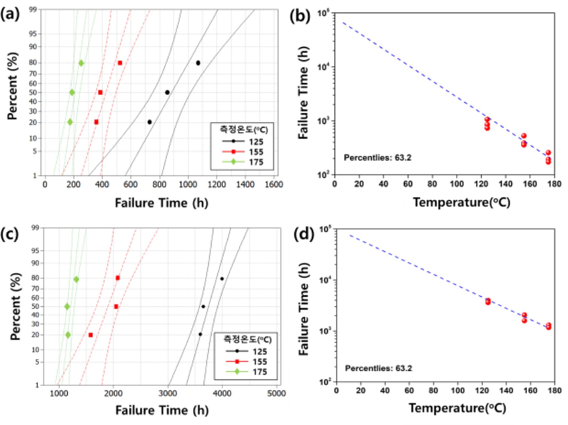 감소시간을 측정하였으며 (신뢰성 평가 기준 RS-KCL-0015) 수명분포를 와이블(Weibull) 분포를 적용하여 평균 고장시간을 산출하였다.