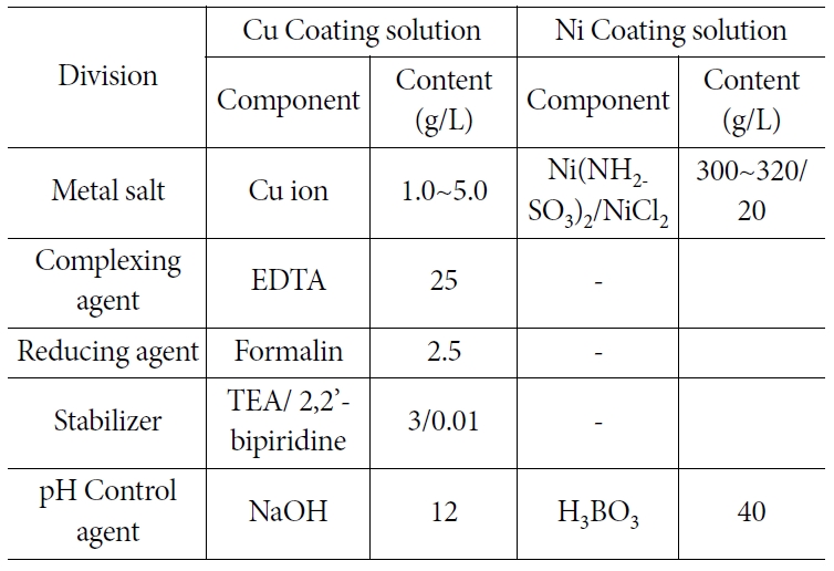 Cu는 pH 12.5에서 37oC에서 6분간 무전해 Cu코팅반응을 수행하였으며, Ni의 경우는 7 V의 정전압을 인가하면서 55oC 온도 하에서 1분간 전해