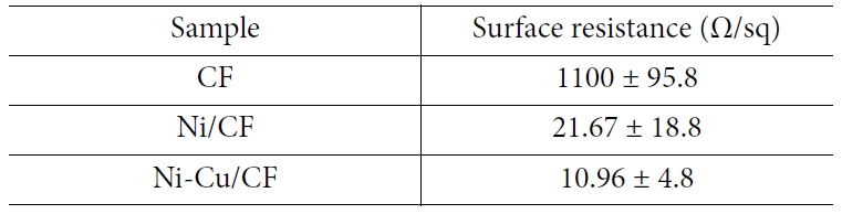 표면저항 값을 나타낸 반면 금속 코팅층을 형성한 CF (Cu/CF, Ni-Cu/CF) 시트는 CF 시트와 비교하여 크게 감소한 표면저항 값을 나타내었다.