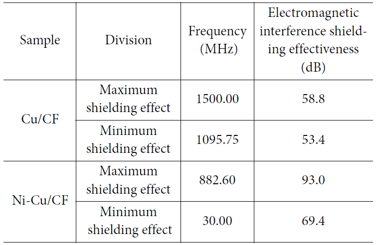 53.4~58.8 dB의 전자파 차폐 성능을 보인 반면 Ni-Cu 이중 코팅층을 형성한 경우 69.4~93.0 dB의 우수한 전자파 차폐 성능을
