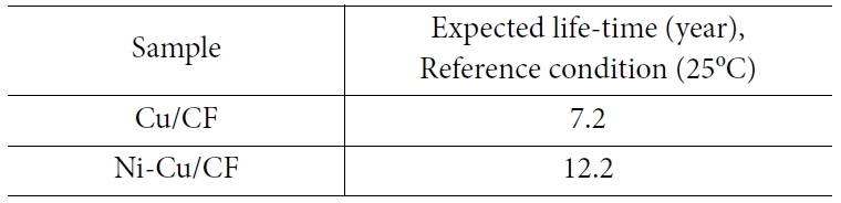 Table 4 Expected life-time of Cu/CF and Ni-Cu /CF sheet (Operating temperature: 25 oC) |