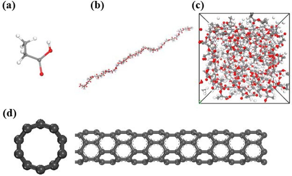 본 연구에서는 50개의 단량체를 중합하여 만든 PLA 사슬과 (5, 0) 단일벽 탄소나노튜브를 포함하는 나노복합재료를 이용하였다. 그림은