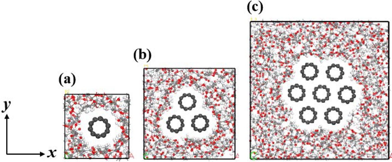 Fig. 1에 제시하였다. 동일한 체적분율에 대하여, 탄소나노튜브의 개수를 조절함으로써 탄소나노튜브 다발을 구성하였다. 탄소나노튜브 간 중심거리는