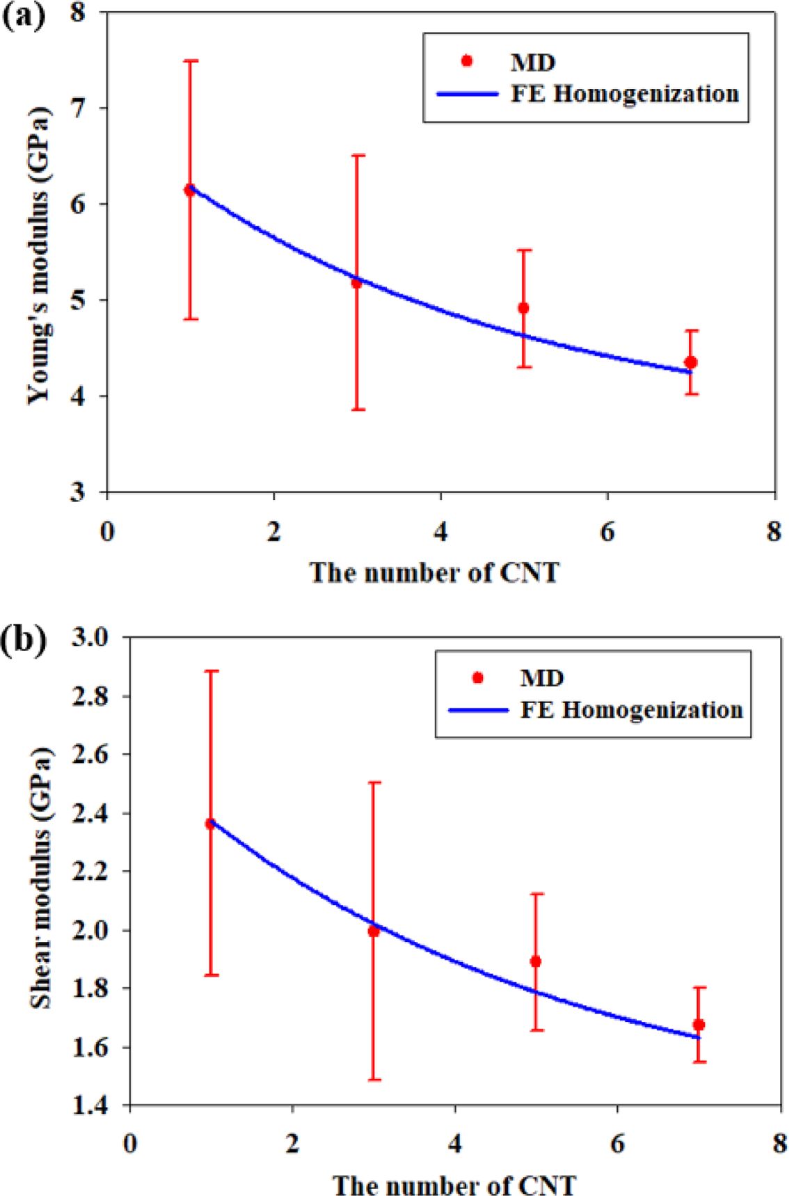 탄소나노튜브의 수가 증가함에 따라 동일한 탄소나노튜브의 체적분율에도 불구하고, 면내 영률 및 면내 전단계수는