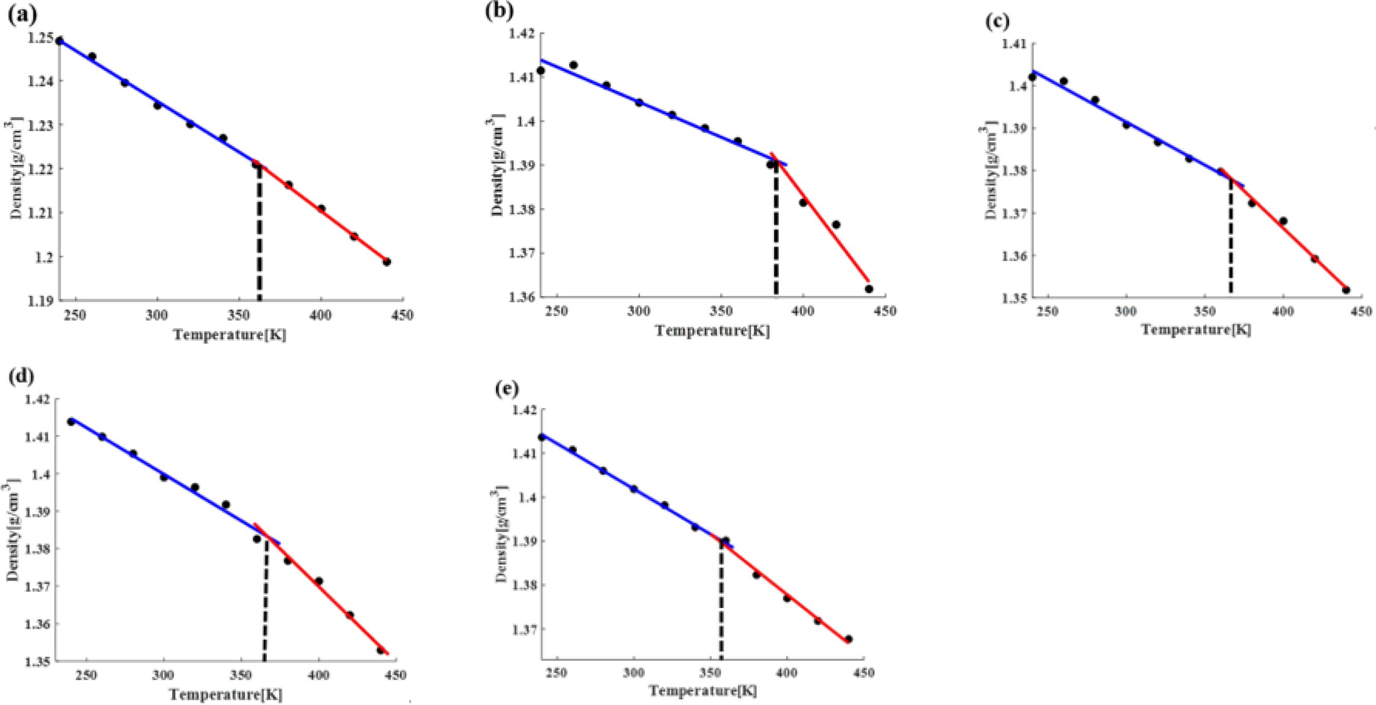 순수한 PLA와 나노복합재료의 온도-밀도 관계를 Fig. 8와 같이 도출할 수 있었다. Fig. 8에서 파란선은 유리상(glassy