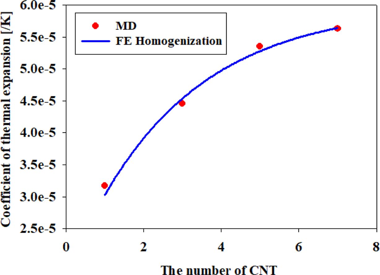 Table 6과 Fig. 10은 제안된 계면 모델과 멀티스케일 균질화 기법을 기반으로 계산한 나노복합재료의 면내 열팽창계수이다. 분자동역학 전산해석을