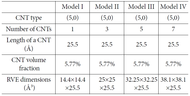 있으며, 열탄성 물성 예측에서의 적절함이 확인되었다[10]. 일정한 체적분율에 대해, 응집된 탄소나노튜브의 수를 조절하며 분자동역학 해석을 수행하였으며,