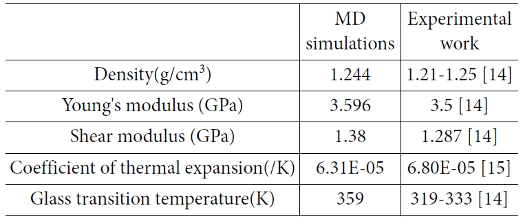 분자동역학 모델링 및 해석을 통해서 예측한 순수 PLA 재료의 밀도, 영률, 전단계수, 열팽창계수, 유리전이온도는 Table 3와 같다.