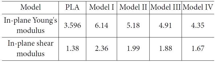 Table 4는 분자동역학 전산모사를 통해 예측한 순수 PLA와 나노복합재료의 면내 영률과 면내 전단계수를 정리한 표이다. 면내 영률과