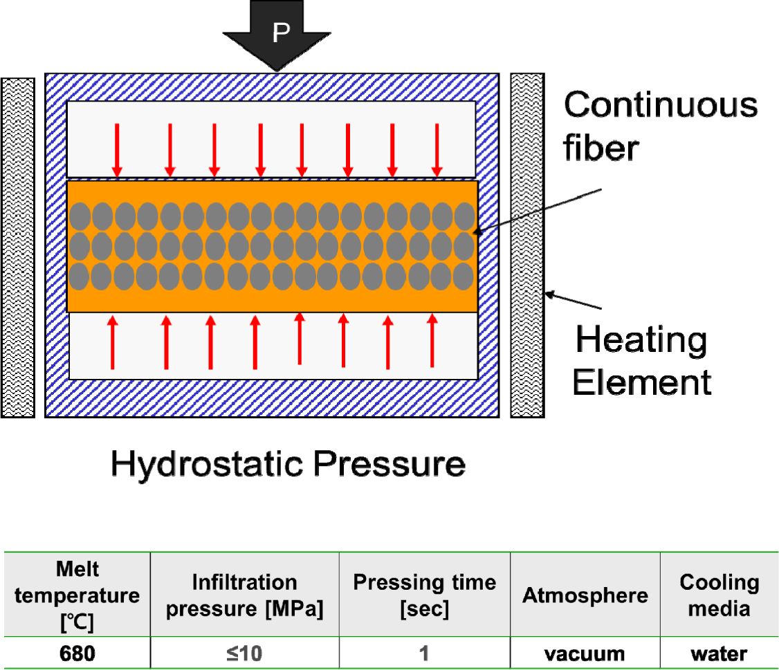 금형 크기로 절단한 SiC 섬유를 금형 내부에 AZ91 기지금속과 함께 적층한 후 액상가압성형 장비에 장입하고 680oC에서 10 MPa 이하의