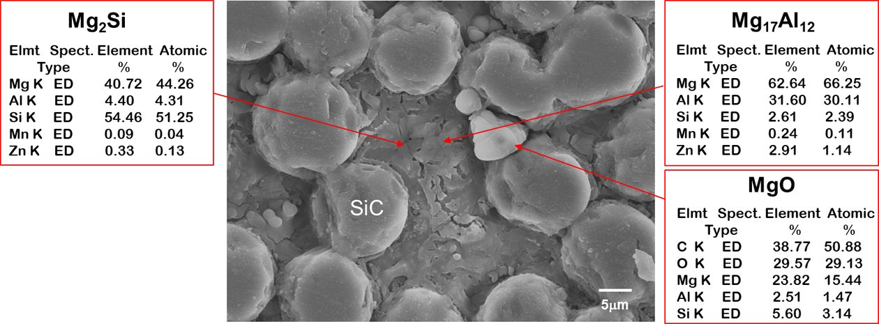 경우 액상의 Mg와 SiC의 반응에 의하여 SiC 표면을 따라 형성된 것을 알 수 있다. 한편, 일부 MgO상이 형성되어 있음을 확인할 수 있었는데,