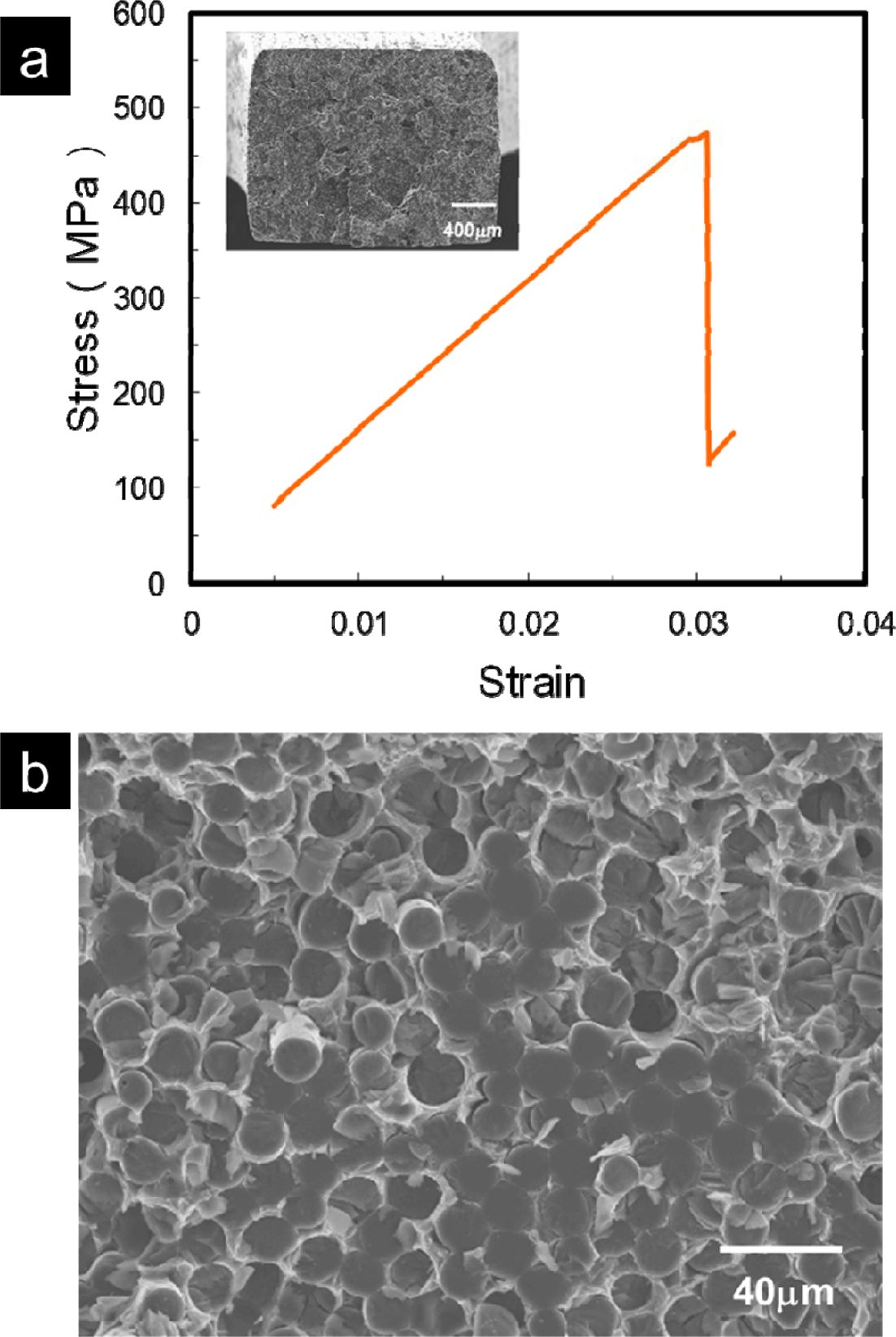 Fig. 7 (a) Tensile stress-stain curve, and (b) fractured surface