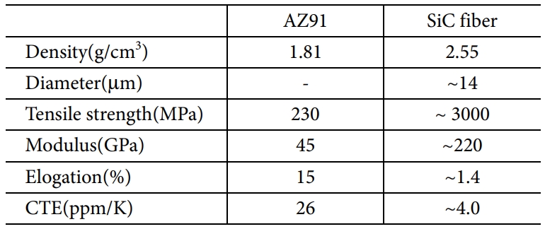 AZ91 및 SiC fiber의 물성을 정리하였다.