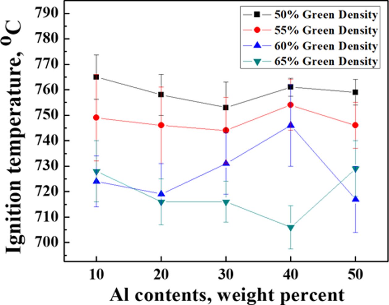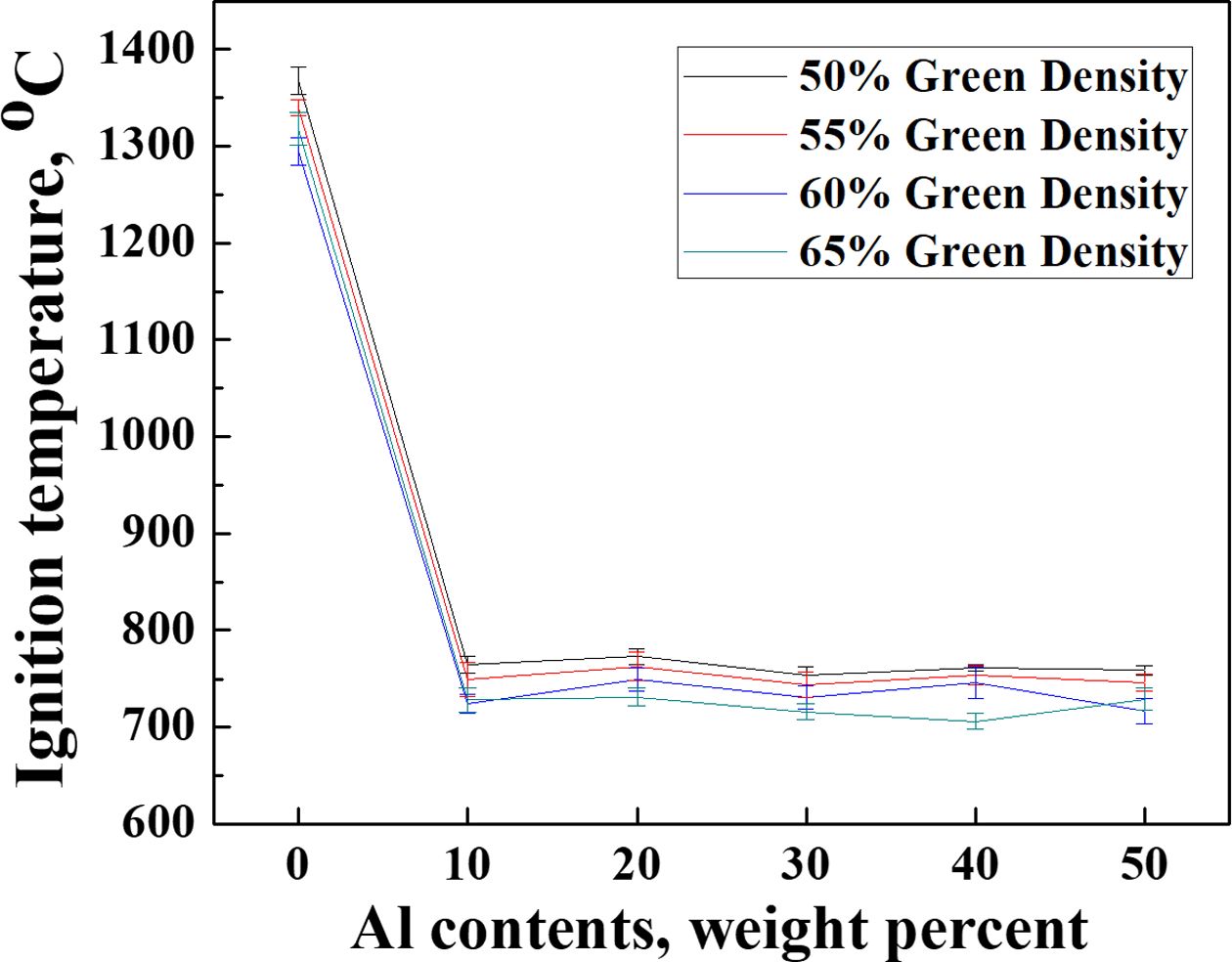 Fig. 2 Effect of Al addition on ignition temperature with varying green density |