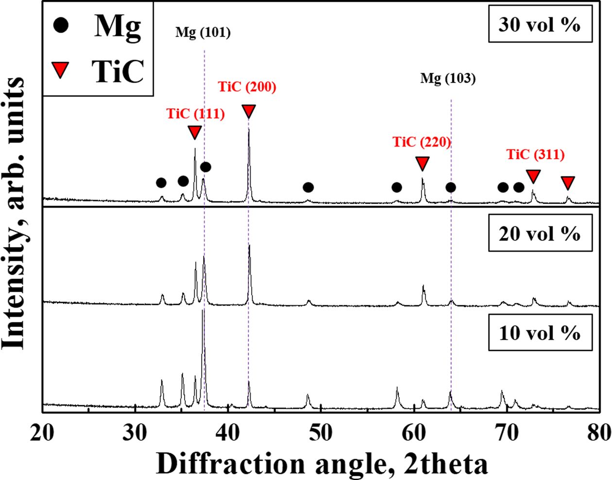 강화된 Mg 기지 복합재의 XRD 분석 결과이다. 모든 금속복합재료에서 Mg와 TiC 상의 피크가 관찰되었으며, 이것은 Al-Ti-C 반응계의