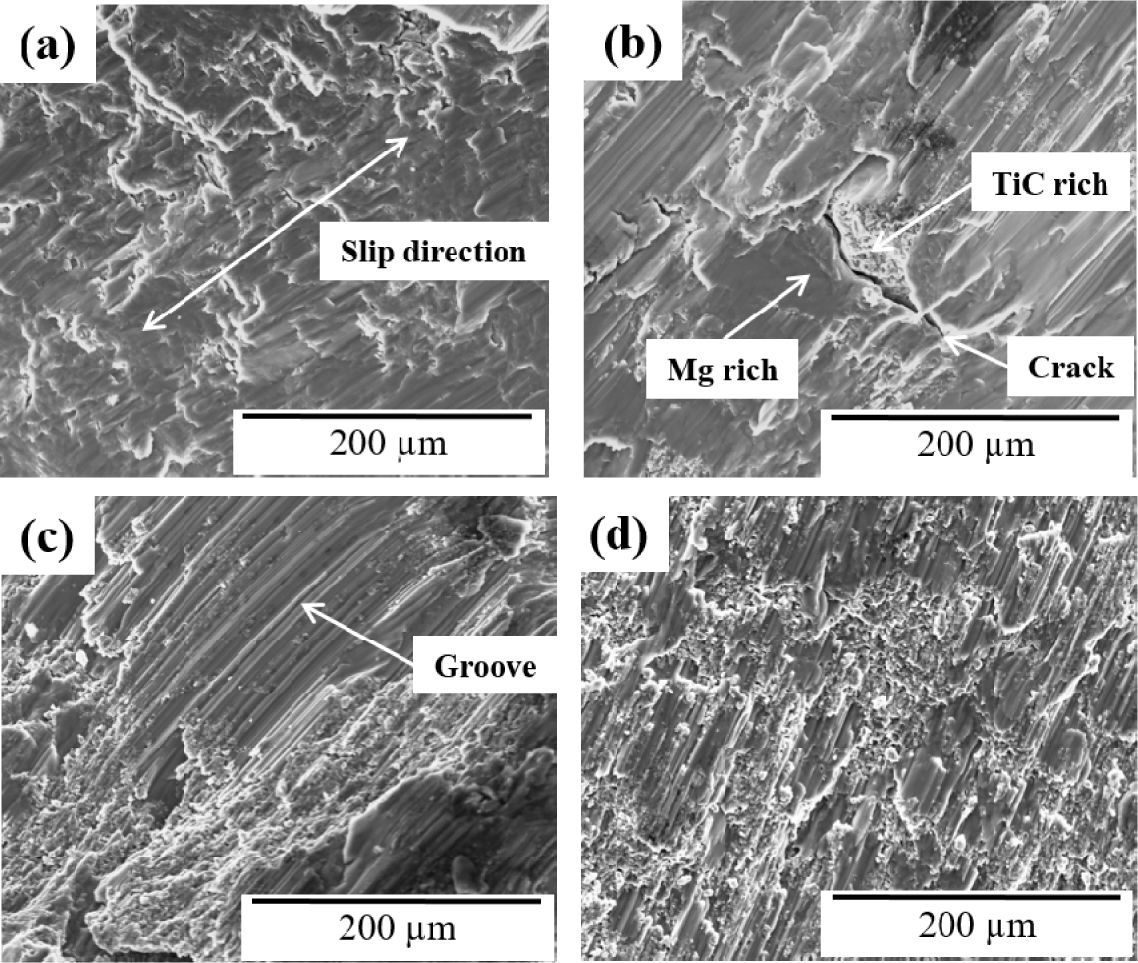 띠었고, 변형중 강화재 입자로 인해 발생하는 groove 등이 관찰되었다. 또한 TiC 강화재가 모여있는 cluster 부분에 crack이 발생한