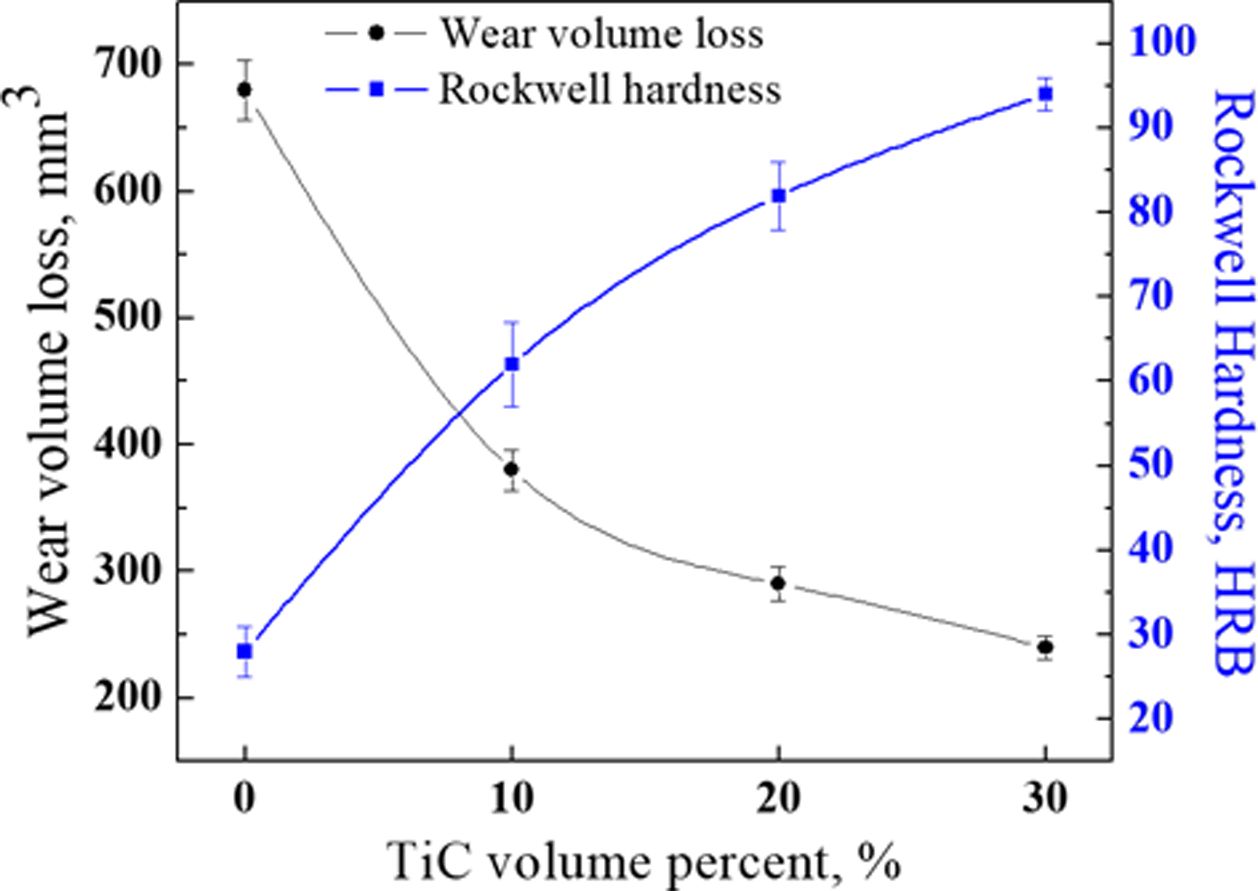 Fig. 8 Wear volume loss and Rockwell hardness with different