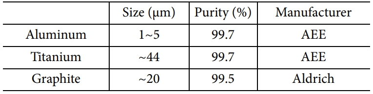 Al-Ti-C 반응계의 자전연소합성 시험을 위한 분말의 세부 스펙을 Table 1에 나타내었다. 알루미늄 분말의 양과 압분체의