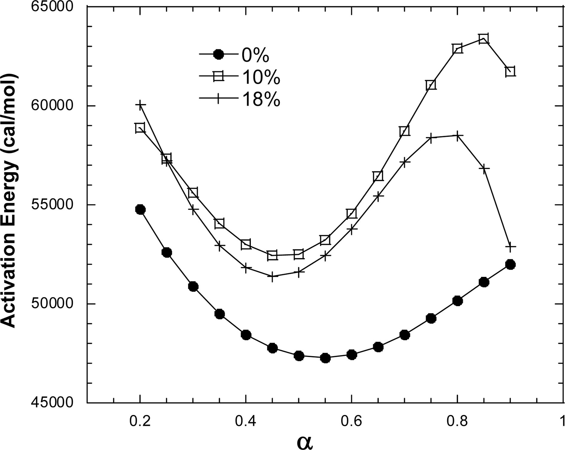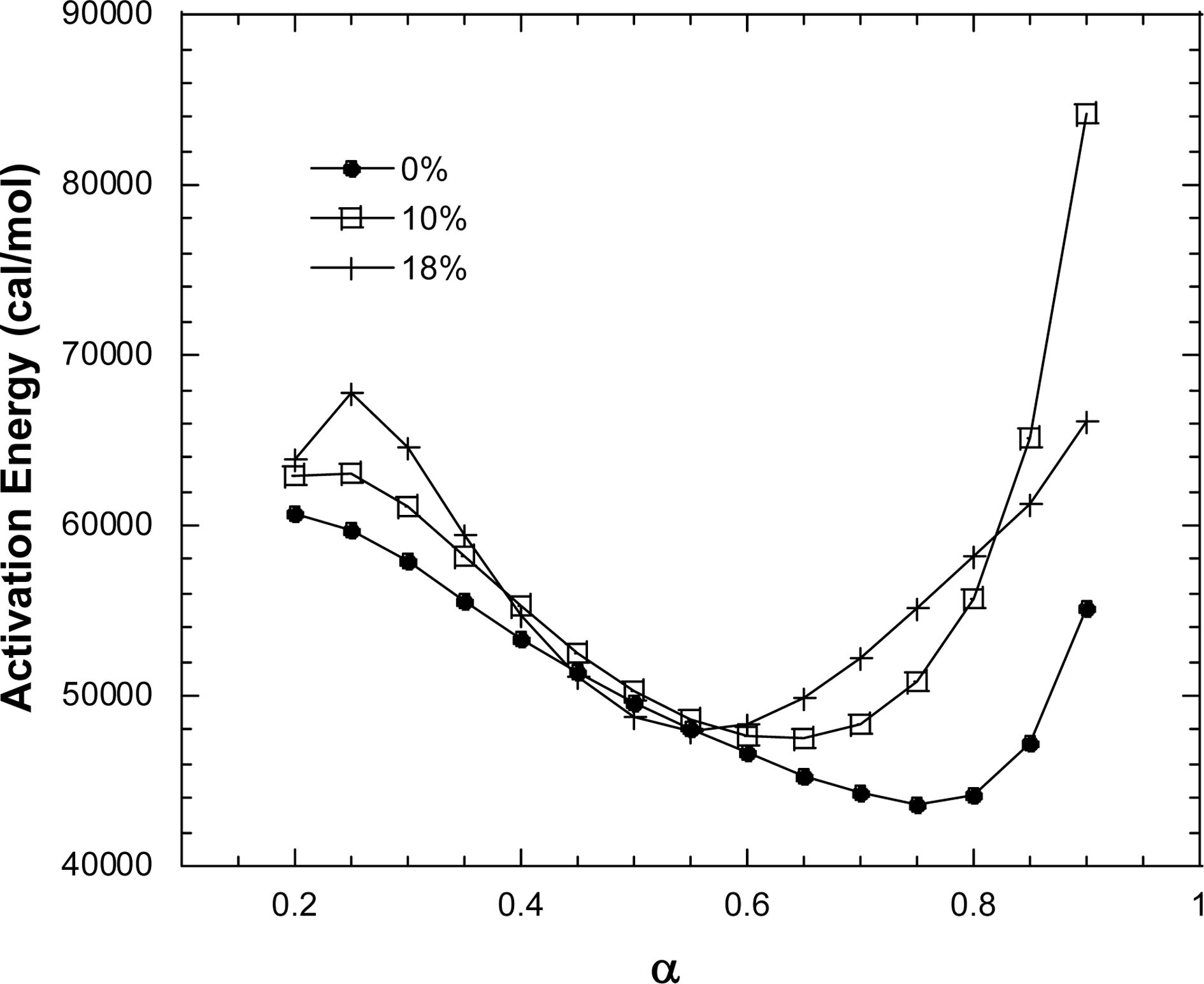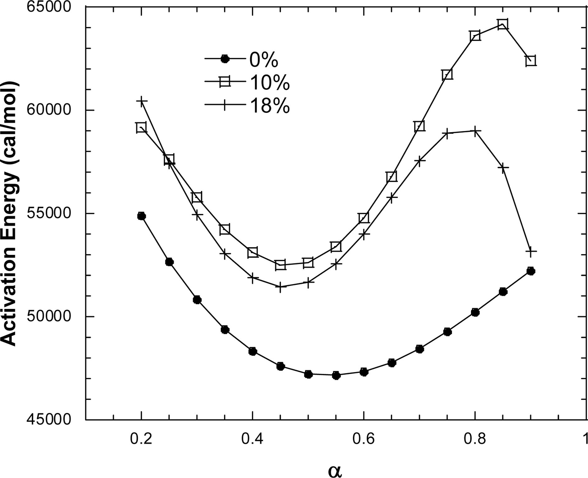 가지며 따라서 우수한 열적 물성을 보이는 것은 Friedman 방법에 의한 결과와 동일하였다. 열화 극초반(a > 0.8)의 활성화에너지는 10%일 때 61.7 kcal/mole 값으로 가장 높은 값을 보이는 반면, 18%의