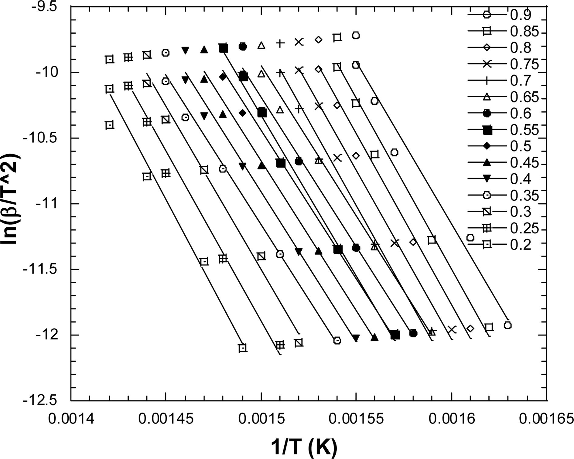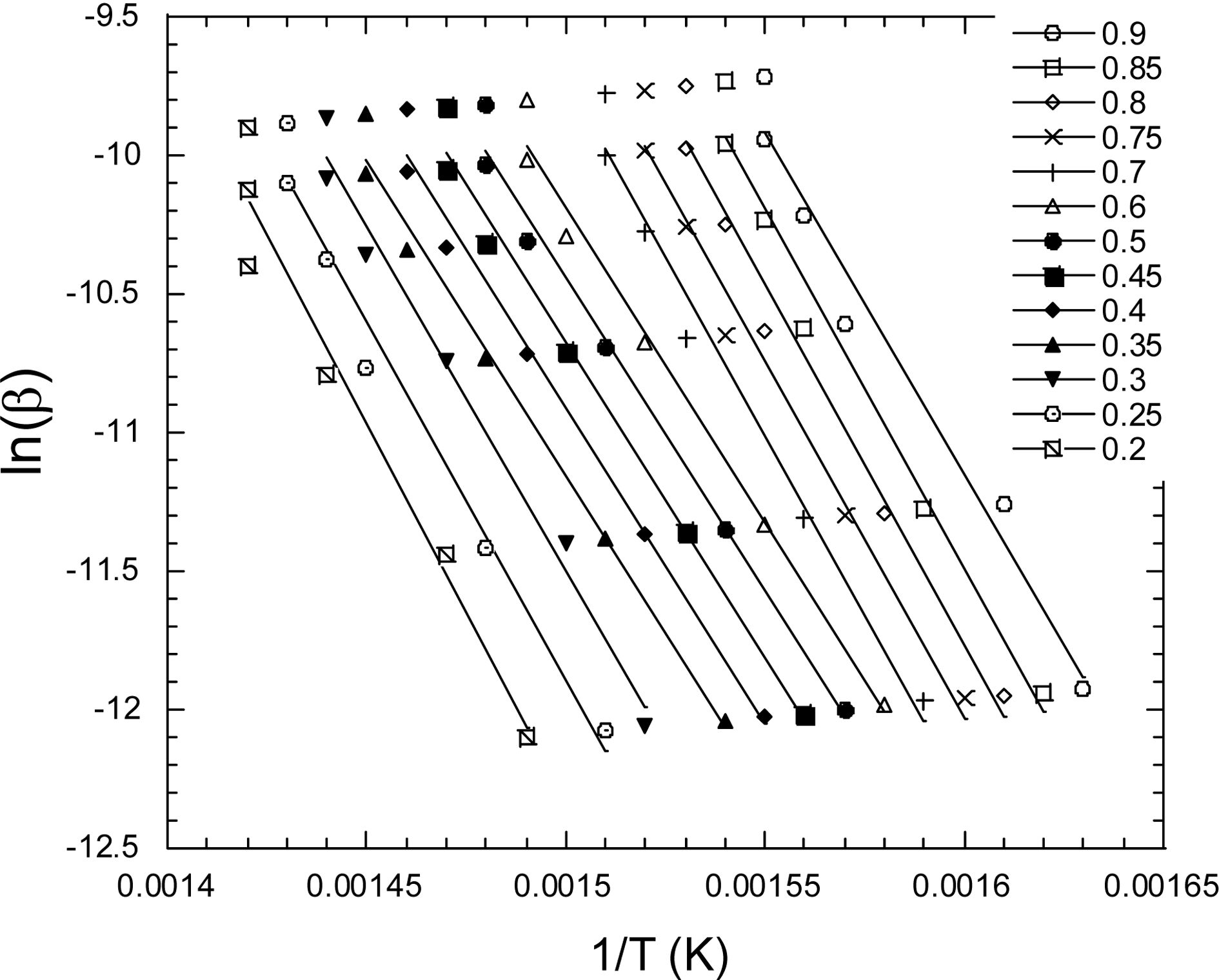 각기 다른 승온률에 대해 전환값이 같은 데이터를 대상으로 선형 추세선을 생성하면, 식 (7)에 의해 기울기에 기체상수를 곱한 값이 활성화에너지로