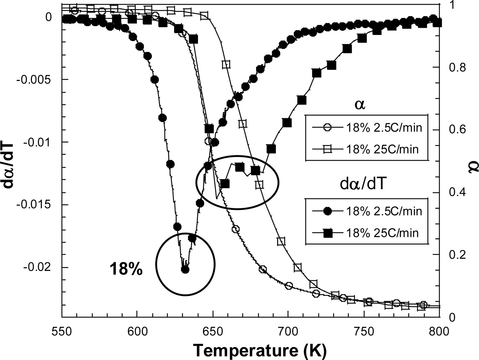 경우 승온률이 높음에 따라 작지만 새로운 Tp 값이 측정되었고, 이러한 현상은 18%인 경우 더욱 두드러져서 25oC/min인 경우 확실한