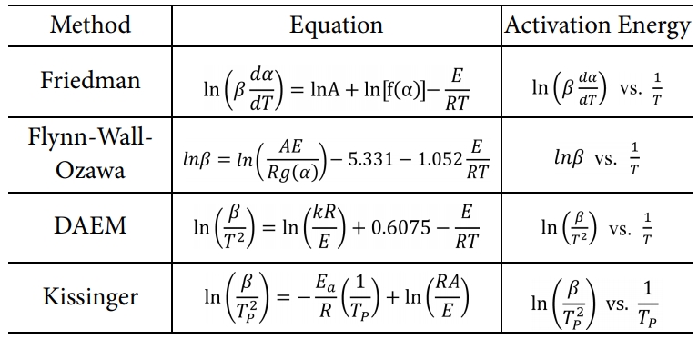 Flynn-Wall-Ozawa, Kissinger and DAEM (Distributed Activation Energy Method),