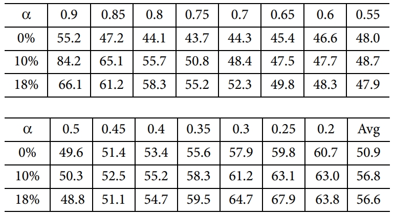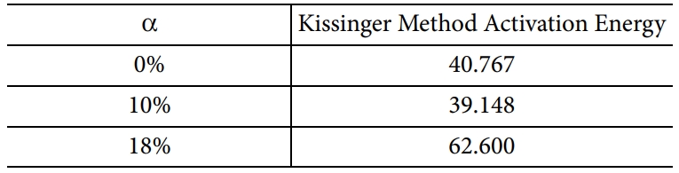 따른 활성화 에너지는 하나의 값으로 도출되고 그 결과는 Table 6에 나타나 있다. 결과에서 보는 바와 같이 0%와 10% 샘플의 값이 유사하고