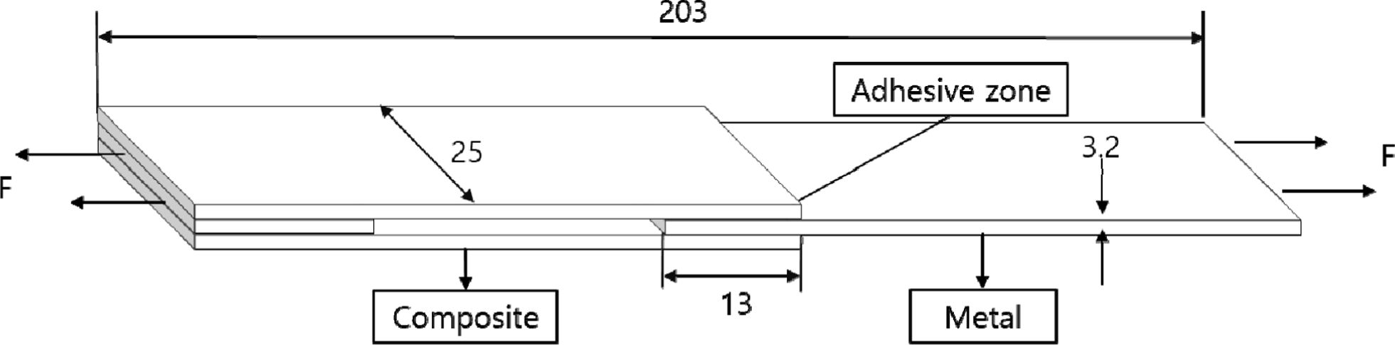 이종 재료 간의 접착전단강도를 측정하기 위해 사용된 시편의 형상은 Fig. 1 과 같다. ASTM D3528 규격에 따라 시편의 길이