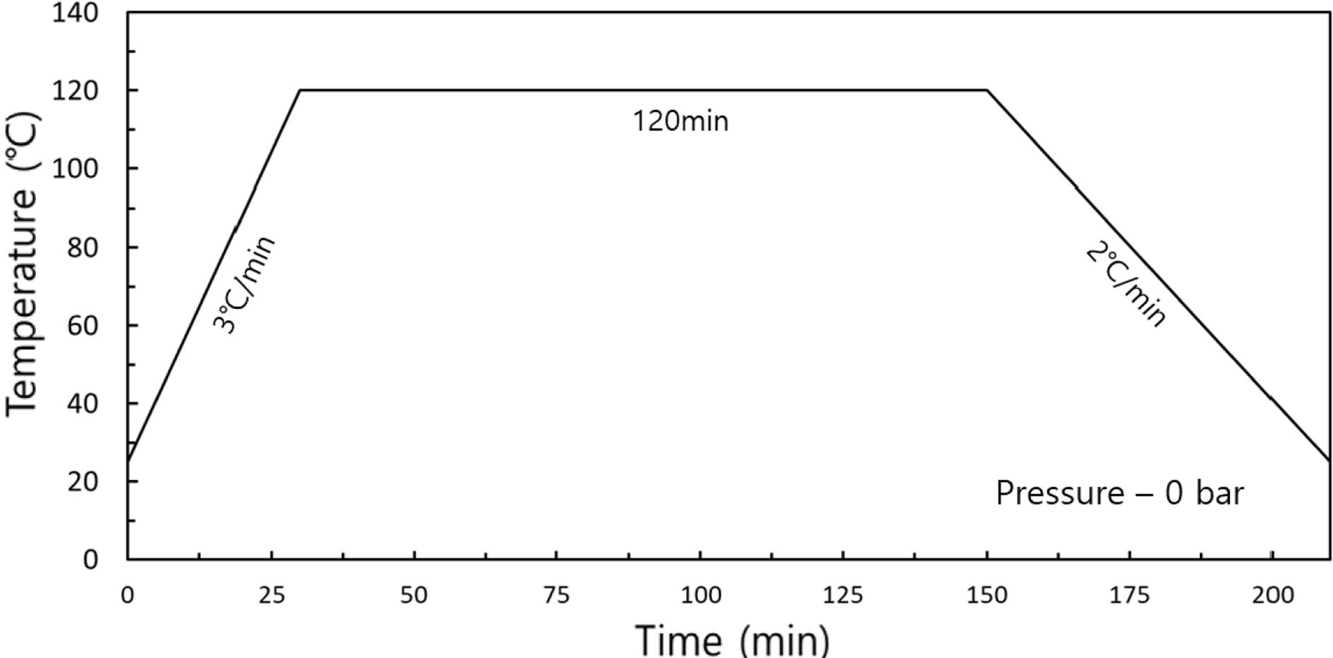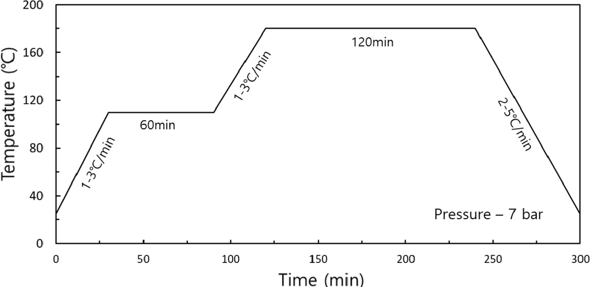 경화 공정은 Fig. 2에 나타냈으며 승온속도는 2.5oC/min이고 110oC에서 60분, 180oC에서 120분을 유지하여