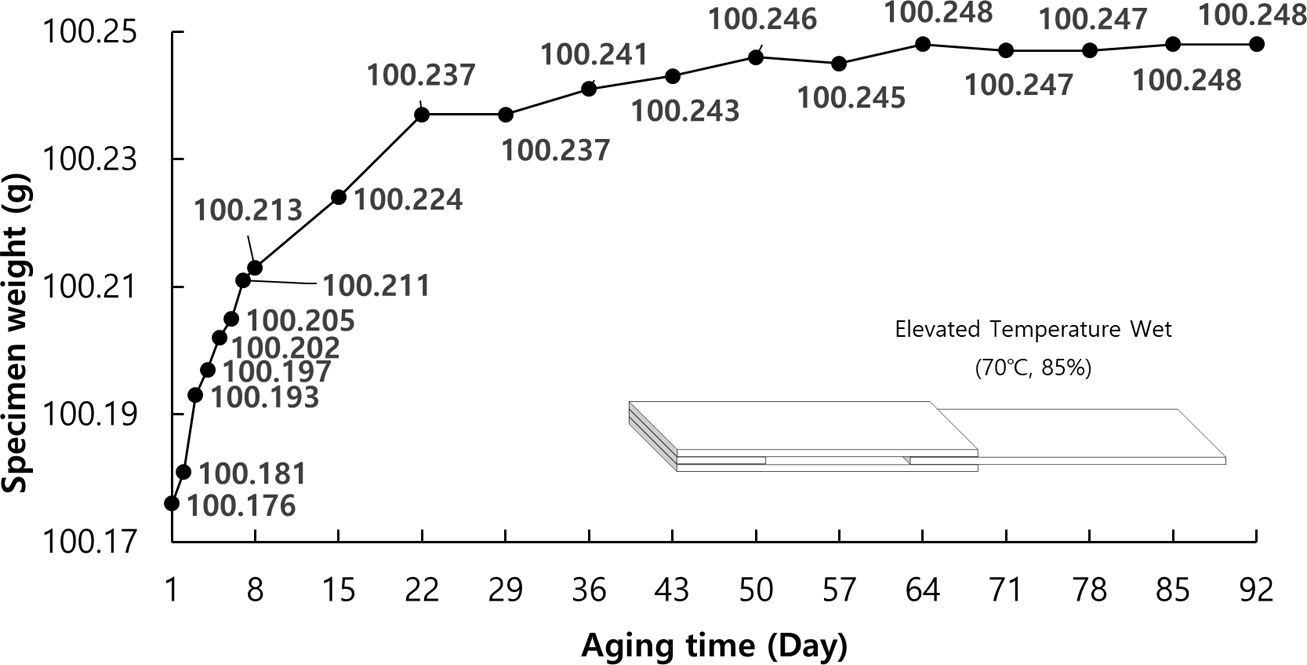Fig. 4에 나타내었다[23]. 시편의 수분 흡습 결과, 초기 21일간 수분 흡습으로 인해 시편의 무게가 증가했으며 수분 노출 21일 이후에는