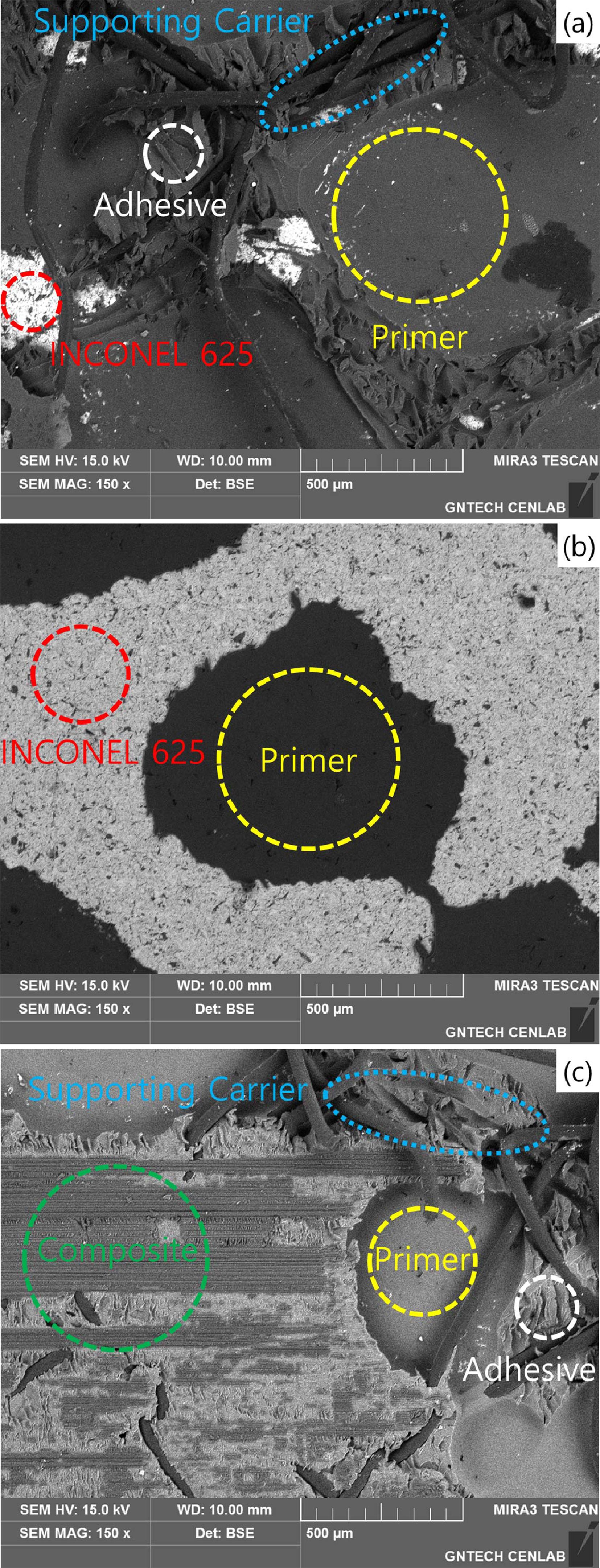 각 시험의 결과값을 Table 3에 나타냈다. 파손 모드는 전자현미경을 통해 후방산란전자 기법, 150배율로 접착부를 촬영했으며