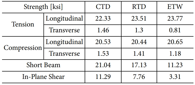 Table 1에 따르면 강도 또한 저온 환경에서 증가하는 것을 확인할 수 있다. 일반적으로 저온 환경에서 기계적 시험을 수행할 경우 섬유와 수지의