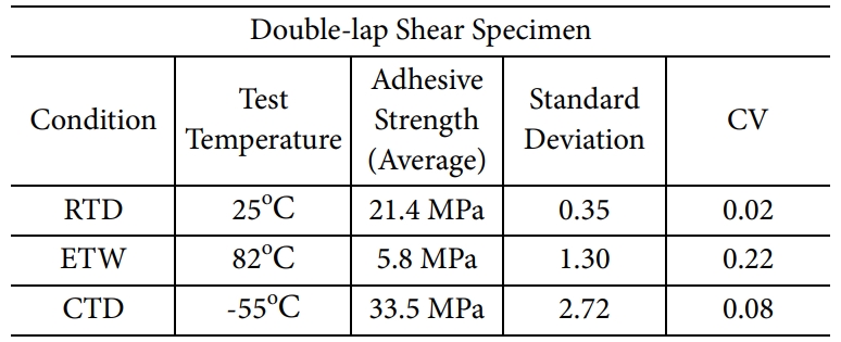 금속 간의 접착된 구조물의 상온 건조(RTD), 고온 흡습(ETW), 저온 건조(CTD)의 환경에 노출된 구조물의 접착전단강도 변화에 대해 연구하였다.