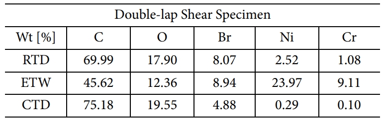 것을 확인하였고 이를 통해 고온에서 침투한 수분으로 인해 접착제의 열화가 진행된 것을 알 수 있다. Table 4에서 금속의 주 성분인 니켈(Ni)이