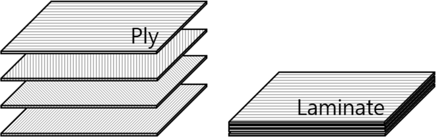 복합재는 Fig. 1과 같이 단방향 섬유강화복합재가 플라이(ply)를 구성하고 이러한 플라이가 층층이 쌓인 적층판(laminate)의