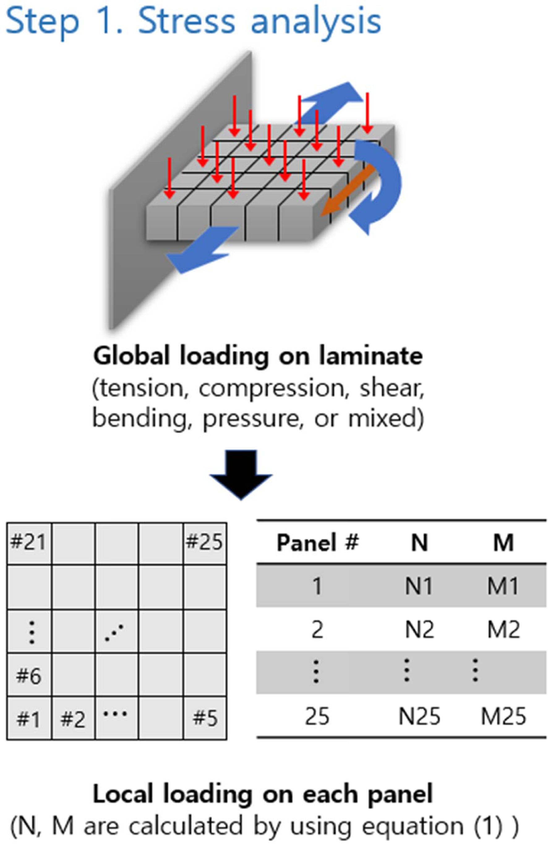 Step 1: Fig. 4에서, 복합재 적층판을 여러 개의 패널로 나누고, 구조해석을