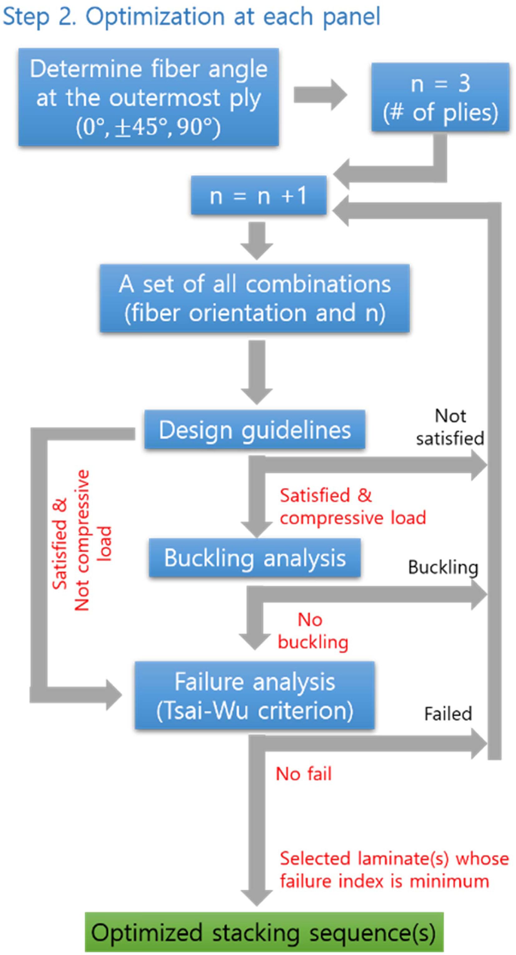 순서를 설계 변수로, 파손 지수, 좌굴 하중 계수 및 설계 지침들을 설계 제한 조건으로 설정하였다. 복합재 적층판의 중량을 더 줄이기 위해, 복합재료