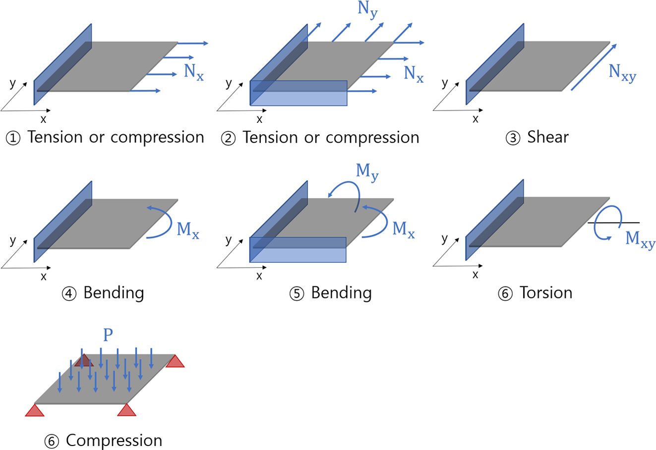 강성이다. (10)로부터 구한 좌굴 하중 계수 l에 대하여 l≤1은 좌굴에 의한 파손이 발생했음을 의미한다. 본 논문에서는 m, n 값을 각각 1~10까지 적용하여 총 100가지 경우에 대해 l 값들을 계산 후 그 중에 최솟값을 사용하였다. x 방향으로(y 방향으로만)만 압축 하중이 가해지는