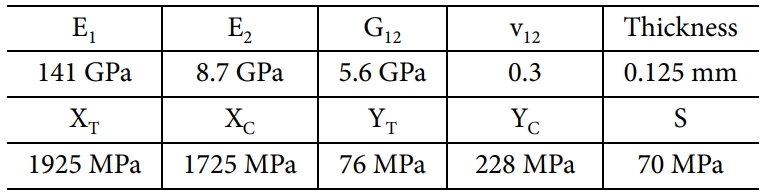 설계에 사용된 탄소섬유강화 복합재 UD/carbon epoxy의 물성은 Table 1에 정리하였다[16]. Fig. 7에서 응력 분포를 고려하기 위해 50 cm * 50 cm 크기의 복합재 적층판을