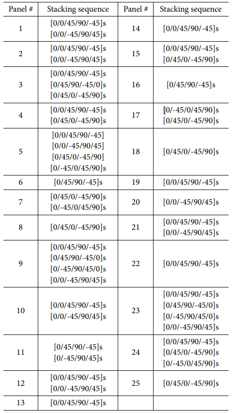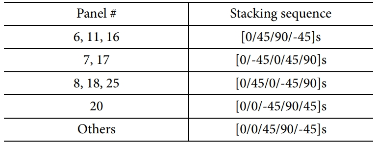 Step 2에서 최외각층의 적층각을 0°로 정하고 각 패널의 최적의 적층 개수와 적층 순서를 결정하였다(Table 3). Table 3에서 2개의