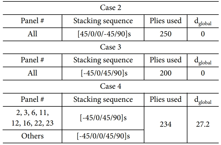 유사도를 높였다. Case 1, 4, 5, 7, 8, 9의 최적화 결과와 같이 패널 간 적층 순서의 유사도가 비교적 높은 경우에는 automated tape laying 기술[17]을 이용하여