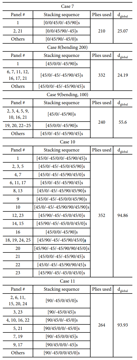 최적화를 수행하였다(Table 8). Case 10과 11의 결과에서 패널 간 적층 순서가 많이 상이함을 알 수 있는데, 이는 비틀림과 면외 압축