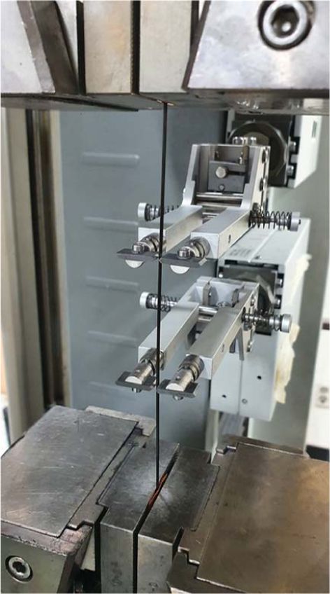 탄성계수를 얻기 위해 변형률은 익스텐소미터(multiXtens, Zwick, Germany)를 사용하여 측정하였으며 시험 속도는 2 mm/min의 변위제어로
