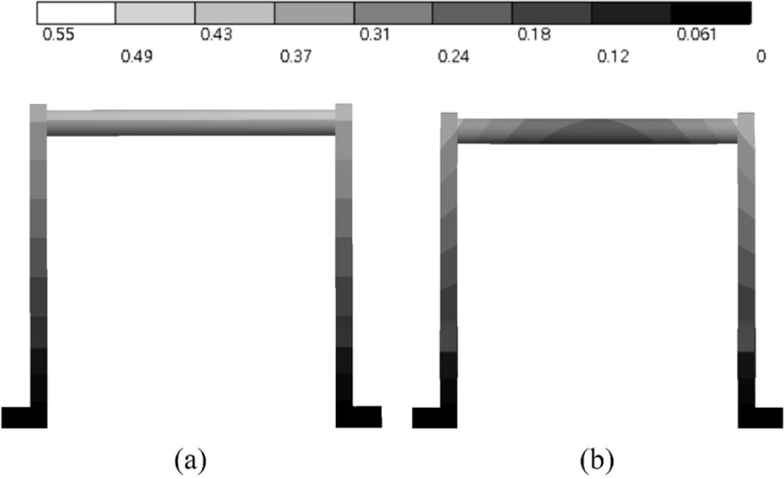 Fig. 5에는 해석된 모델의 변형 양상이 나타나 있다. 이때 (a)는 빔이 스트랜드 시편없이 자유롭게 팽창한 상태이고 (b)는 스트랜드